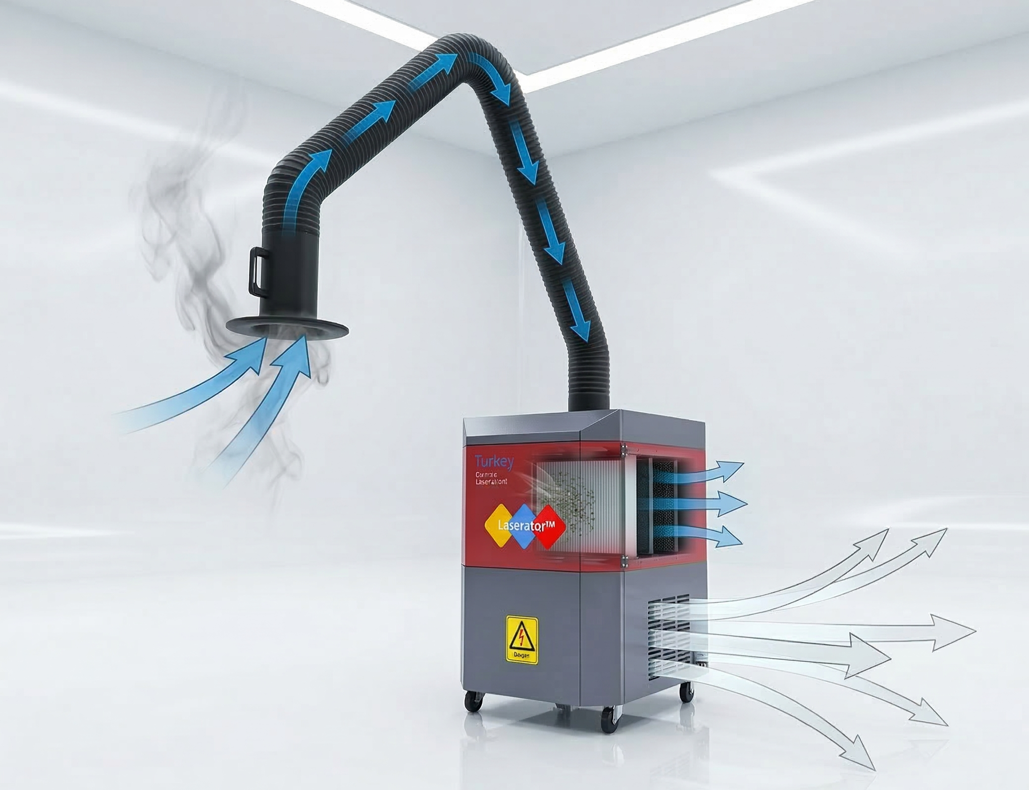 İki kademeli (ön ve ana) filtreleme yapısı, lazer işlemi sırasında oluşan zararlı malzeme tozlarını, dumanı ve kötü kokuyu ortama yayılmadan çeker. Bu sayede hem operatörün solunum sağlığını korur hem de lazer makinesinin hassas optik aksamlarının duman isinden zarar görmesini engelleyerek cihaz ömrünü uzatır.